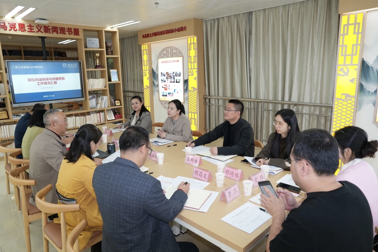 2025年11月4日下午,部校共建必赢bwin官方网站院务委员会专题会议在学院马克思主义新闻观书屋举行。自治区党委宣传部新闻处副处长黄雅丽、广西日报社人事教育处副处长(主持工作)唐群峰、自治区党委宣传部新闻协调小组副组长黄丹、自治区党委宣传部新闻处四级主任科员邓琦琪,以及Bwin必赢领导班子成员出席会议。会议由王仕勇院长主持。